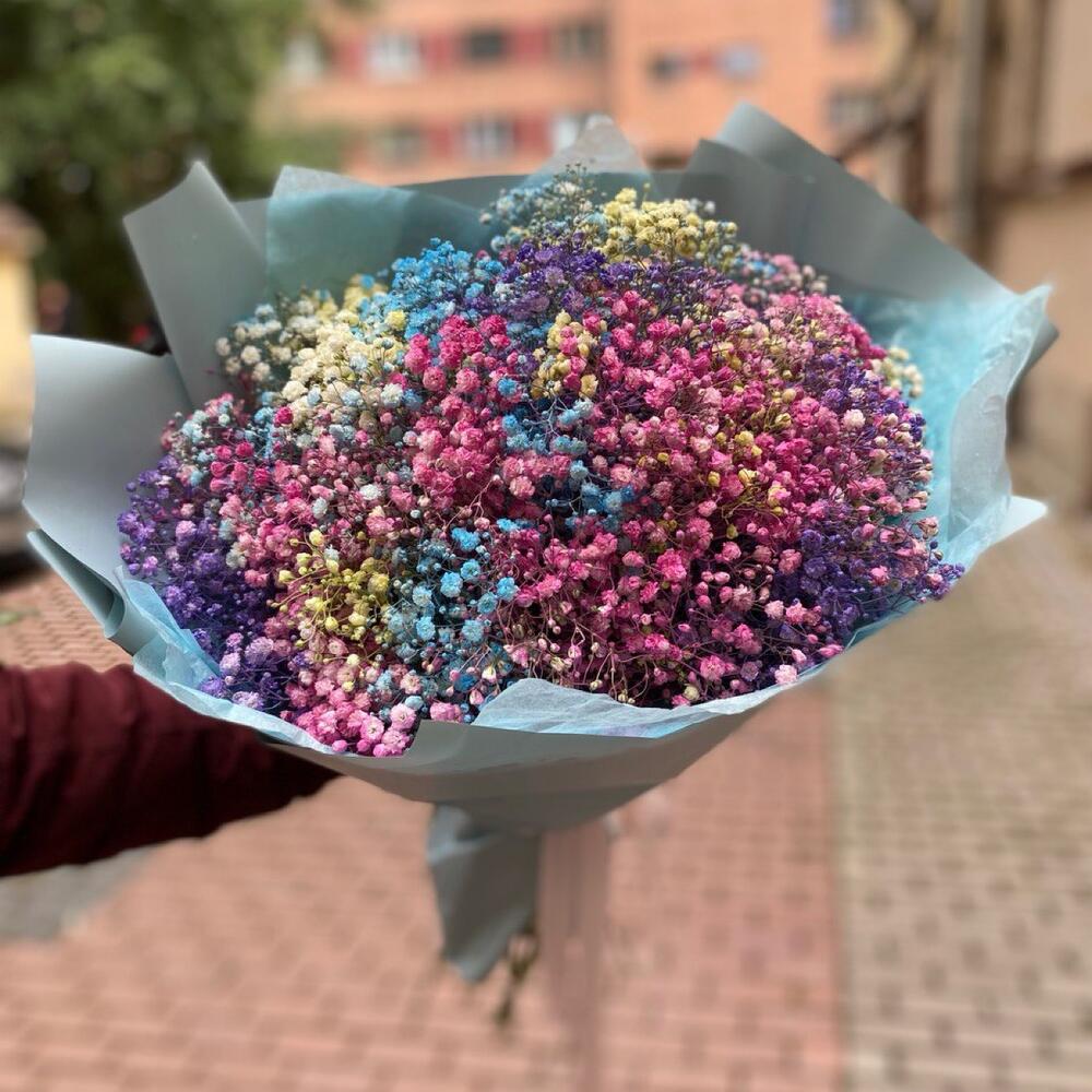 гипсофила радужная окрашенная – 11 шт.Дизайнерская упаковка – 2 шт.Лента атласная – 1 шт.