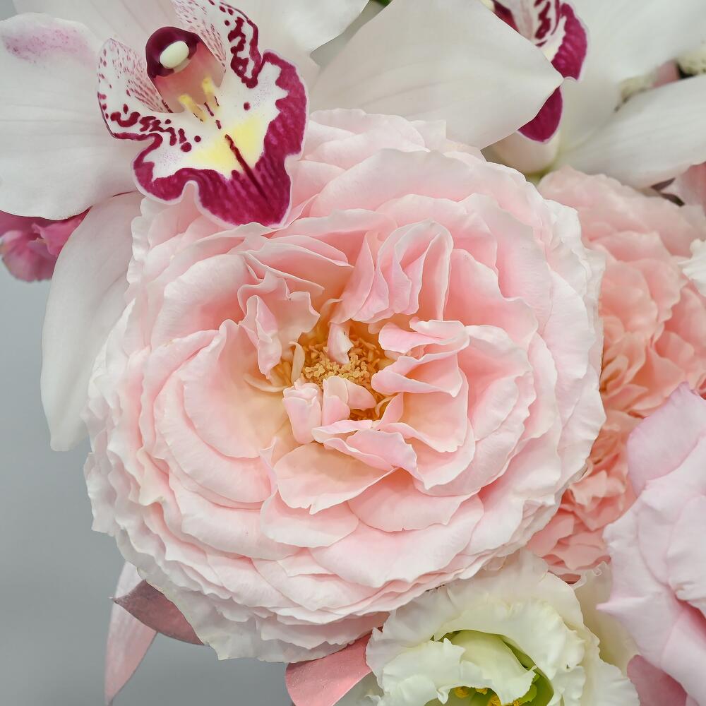 Пионовидная роза – 2 шт.Орхидея Цимбидиум – 2 шт.Эустома – 2 шт.Рускус – 5 шт.Гвоздика – 5 шт.Сантини – 3 шт.Амарант – 1 шт.Тишью – 1 шт.Шляпная коробка – 1 шт.